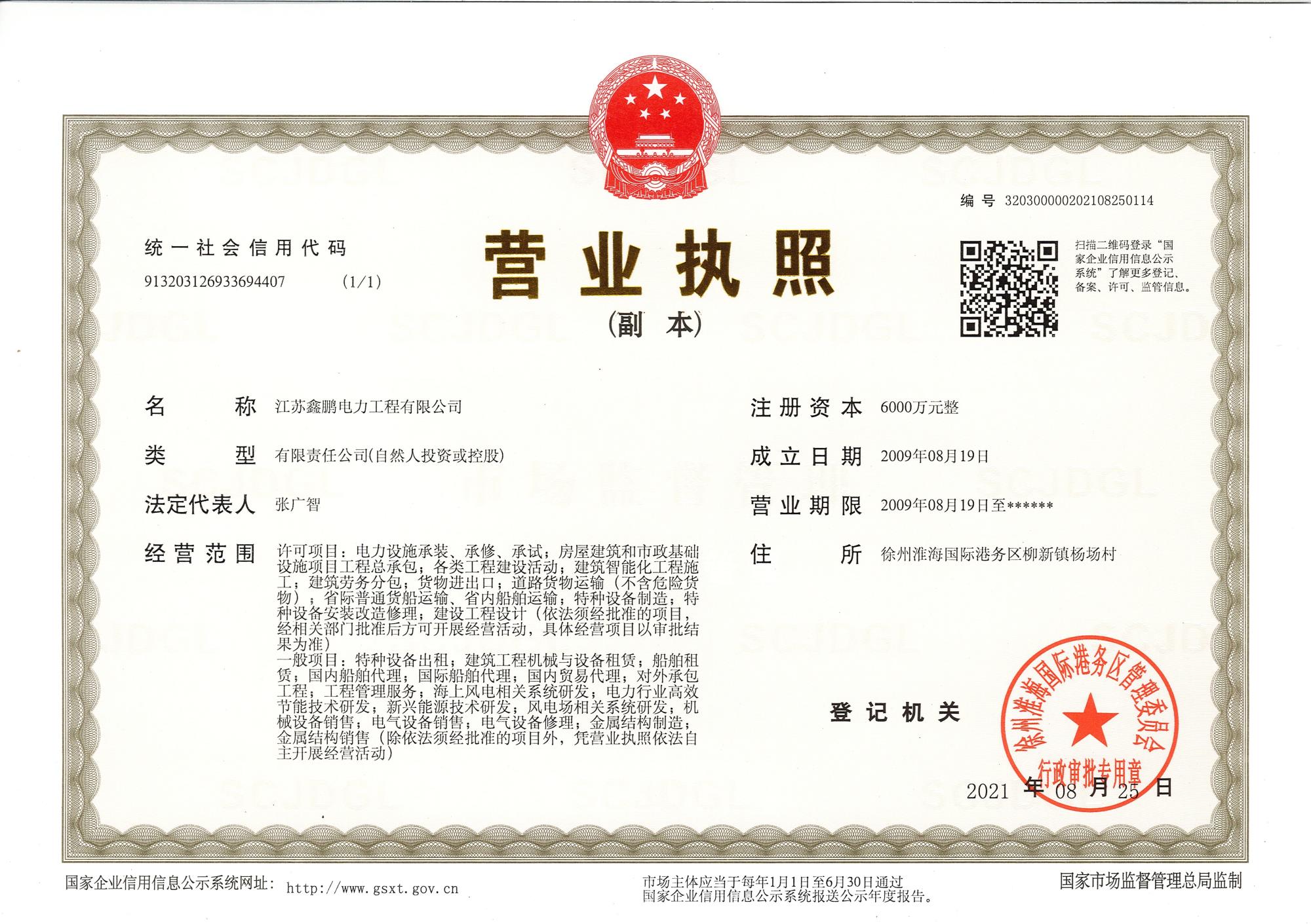 江蘇鑫鵬電力工程有限公司成立于2009年,位于素有“五省通衢”之稱的“古彭”徐州。注冊資金6000萬元,占地50畝。